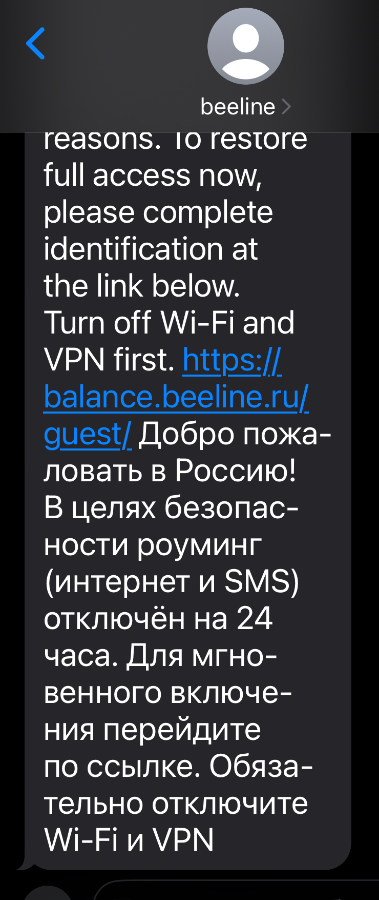 🔹По приезде на Родину в первую очередь нужно отключить VPN и Wi-Fi и перейти по указанной ссылке от оператора.